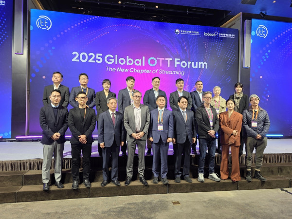 2025 국제 OTT 포럼 참가자들이 기념촬영을 하고 있다.