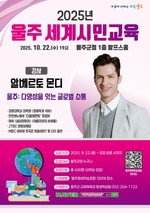 울산 울주군은 오는 22일 오후 7시 군청 알프스홀에서 이탈리아 출신 방송인 알베르토 몬디와 함께하는 세계시민교육 명사 특강을 개최한다고 7일 밝혔다.