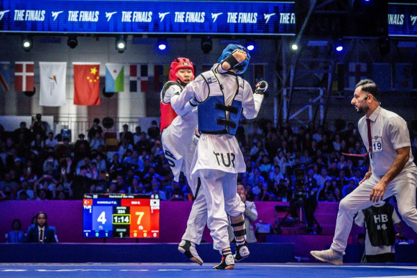 서은수(왼쪽)가 26일 중국 장쑤성 우시의 타이후 인터내셔널 엑스포 센터에서 열린 2025 세계태권도선수권대회 남자 54㎏급 결승에서 공격을 시도하고 있다.