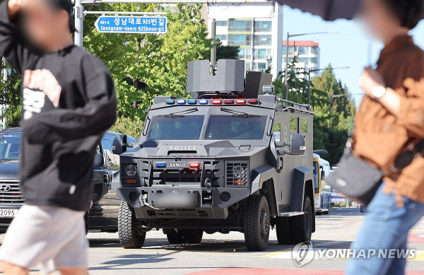 (성남=연합뉴스) 흉기 난동 예고 글과 관련, 경기 성남시 수인분당선 야탑역에서 지난해 9월 23일 경찰특공대 장갑차가 배치돼 있다. 익명 온라인 커뮤니티에는 '23일 오후 6시에 야탑역에서 흉기 난동을 벌이겠다'는 내용의 글이 올라왔다. 2024.9.23